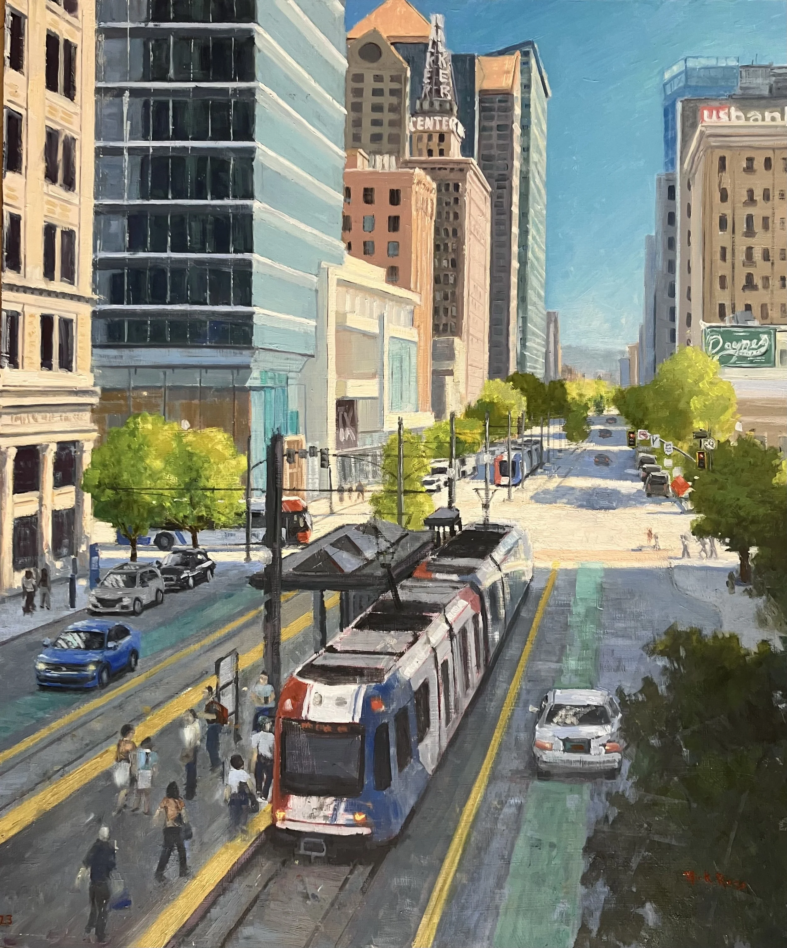View fullsize Catching the Rail on Main 40x30 oil